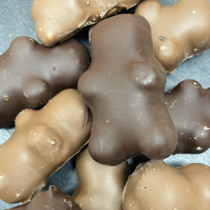 Ingrédients : chocolat* (noir ou lait), sucre*, miel, gélatine.